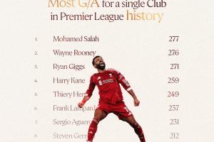 薩拉赫英超單一俱樂(lè)部直接參與277球,超魯尼成歷史第一