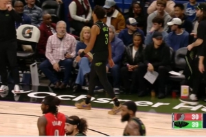 望無大礙!普爾追身三分命中 但后退時(shí)踩到替補(bǔ)席摔倒有些崴腳
