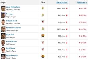 西甲身價(jià)跌幅榜:貝林+羅德里戈跌2000萬最多,拉菲等6人-1000萬