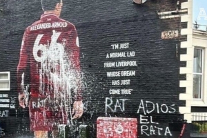 本周中的歐冠皇馬將客戰(zhàn)利物浦,阿諾德重返安菲爾德。賽前,阿諾德在利物浦當(dāng)?shù)氐囊惶幈诋?huà)遭到了球迷的污損。