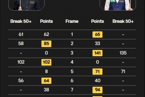全場比賽,江俊打出一桿135分和兩桿50+(71、58),賀國強打出三桿破百(102、109、118)和三桿50+(61、58、56)