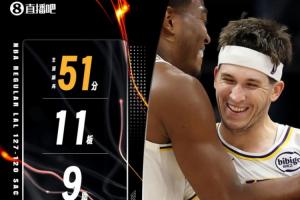 全場比賽他出戰(zhàn)39分鐘,22投12中,三分球10中6,22罰21中爆砍生涯新高的51分外加11板9助2斷,正負值高達+22。