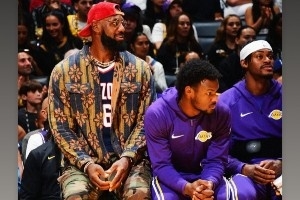 體育資訊10月26日訊 昨日湖人主場(chǎng)迎戰(zhàn)森林狼,詹姆斯身穿小兒子布萊斯在亞利桑那大學(xué)的球衣到場(chǎng)觀賽。