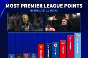 體育資訊11月9日訊 德國轉會市場統(tǒng)并列出近10年英超球隊總積分排名,曼城847分居首,利物浦、阿森納二三位。