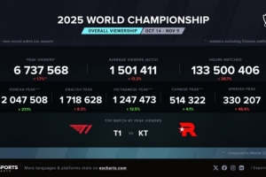 體育資訊11月10日訊 昨日T1和KT的總決賽觀眾峰值達(dá)到了673w,而T1對(duì)陣BLG是694w。