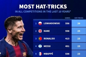 近10年前十聯(lián)賽戴帽次數(shù)排名:萊萬26次居首,凱恩25次、梅羅23次