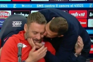 賽后德羅西舉行了新聞發(fā)布會,而就在他接受采訪時,佛羅倫薩前鋒哲科進(jìn)入發(fā)布會現(xiàn)場,并且抱住德羅西連親幾口,哲科還說“祝你好運”。哲科和德羅西過去曾是羅馬隊友,兩人關(guān)系很好,盡管這次作為對手相遇,但哲科還是以這種方式和德羅西打招呼。
