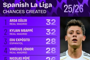 本賽季西甲創(chuàng)造機(jī)會(huì)次數(shù):