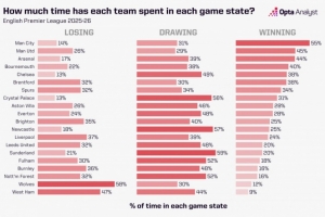 在平均領(lǐng)先時(shí)間方面,曼城、曼聯(lián)和阿森納位居前三,而衛(wèi)冕冠軍利物浦僅能位居第13位。