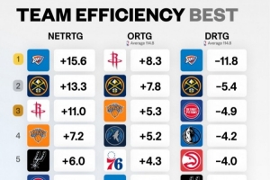體育資訊11月14日訊 美媒Basketball University發(fā)布了賽季至今的各隊凈效率、進攻效率以及防守效率前十的幫當。其中雷霆凈效率+15.6排名第一,進攻效率火箭+8.3排名第一,防守效率雷霆-11.8排名第一。
