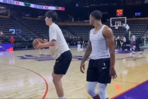 賽前,撕裂之城混音球員們進行投籃熱身,楊瀚森三分試投2投1中。