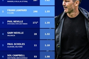 2、蘭帕德(德比郡、埃弗頓、切爾西、考文垂):蘭帕德246場(chǎng),場(chǎng)均1.55分