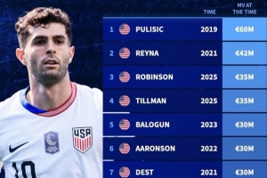體育資訊11月16日訊 德國(guó)轉(zhuǎn)會(huì)市場(chǎng)盤點(diǎn)了美國(guó)球員歷史身價(jià)排名,2019年的普利西奇以6000萬(wàn)歐元排名第一。