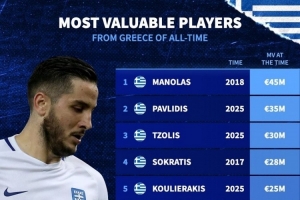 體育資訊11月16日訊 德國(guó)轉(zhuǎn)會(huì)市場(chǎng)統(tǒng)計(jì)了希臘球員的歷史最高身價(jià),并列出希臘球員歷史身價(jià)排名,馬諾拉斯4500萬(wàn)歐居首,帕夫利迪斯3500萬(wàn)歐次席。