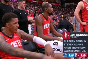 本場(chǎng)比賽火箭四人籃板上雙,據(jù)現(xiàn)場(chǎng)統(tǒng)計(jì),這是自隊(duì)史2001年來(lái)首次。