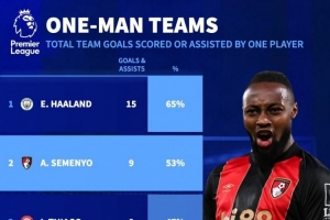 體育資訊11月18日訊 德國轉(zhuǎn)會市場統(tǒng)計了球員本賽季英超參與進(jìn)球數(shù)量占據(jù)球隊總進(jìn)球的比例,并列出榜單,哈蘭德占比65%最高,塞梅尼奧占比53%第二。
