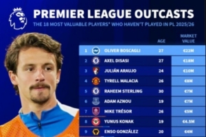 體育資訊11月19日訊 本賽季英超已經(jīng)進(jìn)行了11輪,德轉(zhuǎn)列至今仍未出場(chǎng)球員身價(jià)排行,布萊頓后衛(wèi)博斯卡利2000萬歐居首,切爾西后衛(wèi)迪薩西1800萬歐第二。