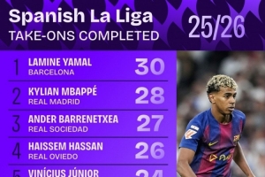體育資訊10月29日訊 Squawka統(tǒng)計(jì)了本賽季球員在西甲的成功過(guò)人次數(shù),并列出榜單,亞馬爾、姆巴佩排名前兩位。