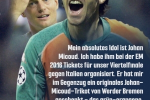 克羅斯還講述了他與米庫交換禮物的事情:“2016年歐洲杯在法國舉行時,我為他安排了我們對陣意大利的四分之一決賽門票。作為回報,他送給我一瓶他自己種植的葡萄酒和一件當年他在不萊梅穿的原版球衣?!?/p>