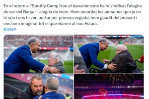 巴薩俱樂部主席拉波爾塔在社交媒體上寫道:“在重返坎普諾的這一天,巴薩球迷們重新找回了身為巴薩人的喜悅與快樂。”