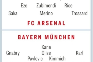 體育資訊11月24日訊 拜仁和阿森納在本輪聯(lián)賽各自取得大勝,兩隊(duì)也將在周中迎來歐冠榜首之爭(zhēng),拜仁作客挑戰(zhàn)阿森納?!短咔蛘摺芬差A(yù)測(cè)了雙方首發(fā):