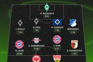 后衛(wèi):?jiǎn)獭に箍ɡㄩT興,7.94分)、凱文·迪克斯(門興,7.83分)、尼古拉斯·卡帕爾多(漢堡,7.83分)、貝爾納多·費(fèi)爾南德斯(霍芬海姆,7.98分)