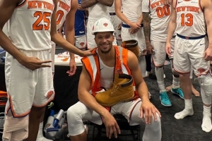 尼克斯戰(zhàn)勝籃網(wǎng),賽后球隊(duì)評(píng)選哈特當(dāng)選本場(chǎng)最佳防守球員,他在更衣室穿工地服裝和帽子與隊(duì)友合影。