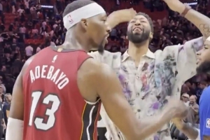 GIF-濃眉和阿德巴約擁抱 向觀眾臺獻(xiàn)飛吻 還尖笑