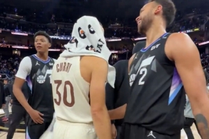GIF-李凱爾賽后與庫里追夢(mèng)小佩頓擁抱互動(dòng)
