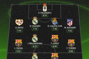 中場:拉明·亞馬爾(巴塞羅那,9.53分)、裘德·貝林厄姆(皇家馬德里,8.37分)、費爾明·洛佩斯(巴塞羅那,8.00分)、費蘭·托雷斯(巴塞羅那,8.82分)