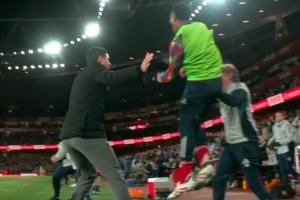 當埃澤第76分鐘破門,上演帽子戲法幫助阿森納4-1領先熱刺時,原本在熱身的斯凱利沖向教練席高高躍起振臂歡呼,隨后他和阿爾特塔為首的教練組相擁慶祝,替補席上的多名隊員隨后也加入慶祝。