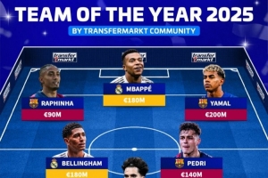 德轉(zhuǎn)票選2025年度最佳陣:姆巴佩、亞馬爾、貝林厄姆、佩德里在列
