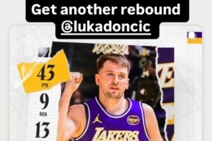 賽后湖人球員拉拉維亞曬出東契奇的數(shù)據(jù)海報(bào),他調(diào)侃道:“你多搶個籃板啊。”