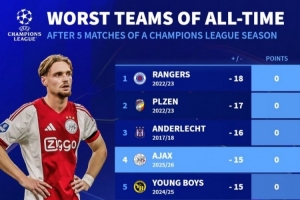 體育資訊11月26日訊 阿賈克斯在本輪歐冠不敵本菲卡,延續(xù)了本賽季至今的糟糕表現(xiàn),《轉會市場》統(tǒng)計顯示他們也是歐冠歷史前5輪同期戰(zhàn)績并列第4差。
