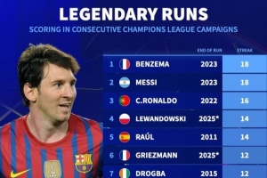 體育資訊11月27日訊 《轉(zhuǎn)會(huì)市場(chǎng)》統(tǒng)計(jì)了歐冠歷史賽季連續(xù)進(jìn)球情況,梅西和本澤馬并列居首。
