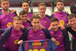 體育資訊11月27日訊 巴薩官推曬視頻,費(fèi)爾明獲得了俱樂(lè)部百場(chǎng)里程碑球衣,并在隊(duì)友的簇?fù)硐抡故玖饲蛞隆?/p>