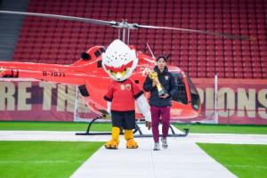 激動人心的奪冠視頻過后,大家的目光被靜候在內(nèi)場的臨港捷運紀(jì)念版直升機(jī)吸引,儀式開始前,這架直升機(jī)載著王燊超和獎杯從川沙飛抵球場。這一環(huán)節(jié)不僅是榮耀的展示,更是俱樂部積極探索“低空+足球”體旅融合新范式的生動實踐。隨后,王燊超與俱樂部總經(jīng)理沙良昌共同將新賽季冠軍獎杯安放于柱頂,與三座往屆火神杯組成“冠軍獎杯矩陣”,將現(xiàn)場氛圍推向高潮。