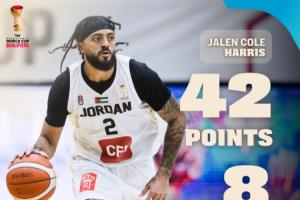 此役,約旦歸化球員、前同曦外援杰倫·哈里斯表現(xiàn)神勇,他登場29分56秒24投13中,三分16中8、罰球9中8,狂砍42分6籃板2助攻2搶斷,正負值+49。