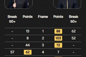 斯科特·唐納森打出兩桿50+(62、52),馬克·艾倫打出單桿57分,上半場(chǎng)斯科特·唐納森3-1領(lǐng)先馬克·艾倫,中場(chǎng)休息后斯科特·唐納森連勝三局,最終6-1戰(zhàn)勝馬克·艾倫,晉級(jí)16強(qiáng)。