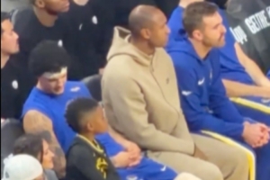 比賽中鏡頭捕捉到有趣的一幕:追夢上場比賽時,他的兒子小追夢坐在他的位置上認真觀看,幫爸爸暖凳子。