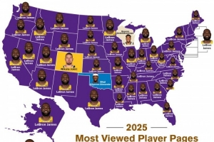 BBR2025年美國(guó)各州被瀏覽次數(shù)最多的NBA球員:詹姆斯霸榜47個(gè)州