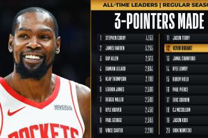 本場(chǎng)比賽,杜蘭特達(dá)成兩項(xiàng)里程碑,除了生涯突破31000分外,他的三分命中數(shù)(2223)也超過(guò)賈馬爾·克勞福德(2221),獨(dú)享歷史第12名。