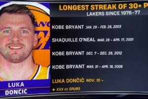 東契奇連續(xù)9場得分30+ 76-77賽季以來湖人第四長&僅次科比奧尼爾
