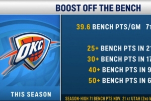 本賽季的雷霆有13場比賽至少2名替補(bǔ)球員得分10+,3場比賽至少3名替補(bǔ)得分10+。