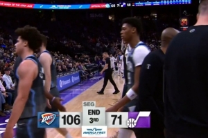 前三節(jié)比賽,場上完全呈現(xiàn)出一邊倒的局面,爵士三節(jié)過后已經(jīng)讓雷霆得分破百并落后多達35分,更為可怕的是,爵士三節(jié)拿到71分比雷霆半場結(jié)束時的74分還少3分。