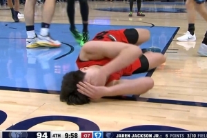 "倒地不起之后,裁判并沒有吹停比賽。根據(jù)規(guī)則,在這種情況下比賽通常不會被叫停。我記得卡梅隆·安東尼曾經(jīng)也有過類似的情況,他在一次比賽中臉部被擊中后倒地,幾乎整整一分鐘的比賽時間內(nèi)都躺在地上,期間雙方進行了多次攻防轉(zhuǎn)換。這時除非教練叫暫停,否則比賽一般不會因此中斷。有時候裁判會吹停比賽,但如果球員沒有妨礙到比賽進行,他們通常不會這么做。像這樣的情況,比賽還是會繼續(xù)進行,直到出現(xiàn)自然的停頓或者有人叫暫停。如果沒有的話,裁判也沒有義務(wù)必須吹停比賽。我并沒有覺得裁判在操控比賽。”