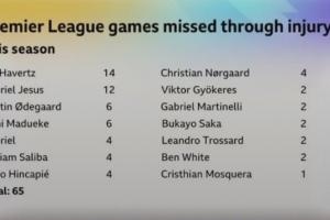 BBC統(tǒng)計阿森納本賽季截止目前的傷病,因傷導致的球員缺戰(zhàn)英超總場次數(shù)已達到65場。