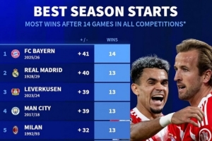 體育資訊10月31日訊 拜仁在昨晚德國杯4-1逆轉(zhuǎn)科隆,賽季開局各項賽事14場全勝打破五大聯(lián)賽球隊歷史紀錄,《轉(zhuǎn)會市場》也統(tǒng)計了五大聯(lián)賽球隊歷史單賽季各項賽事前14場的勝場情況。