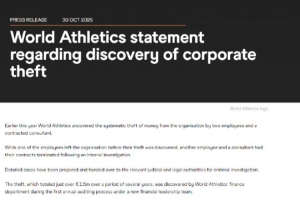 體育資訊10月31日訊 世界田聯(lián)官網(wǎng)發(fā)布文章,兩名雇員和一名簽約顧問在數(shù)年時(shí)間里系統(tǒng)性從田聯(lián)竊取超150萬歐元。