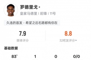羅德里戈本場(chǎng)數(shù)據(jù):1進(jìn)球1過(guò)人成功+傳球成功率96.7%,評(píng)分7.9